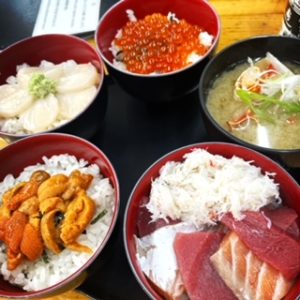 ちょっと奮発してウニやイクラ、ホタテのミニ海鮮丼やカニの味噌汁を